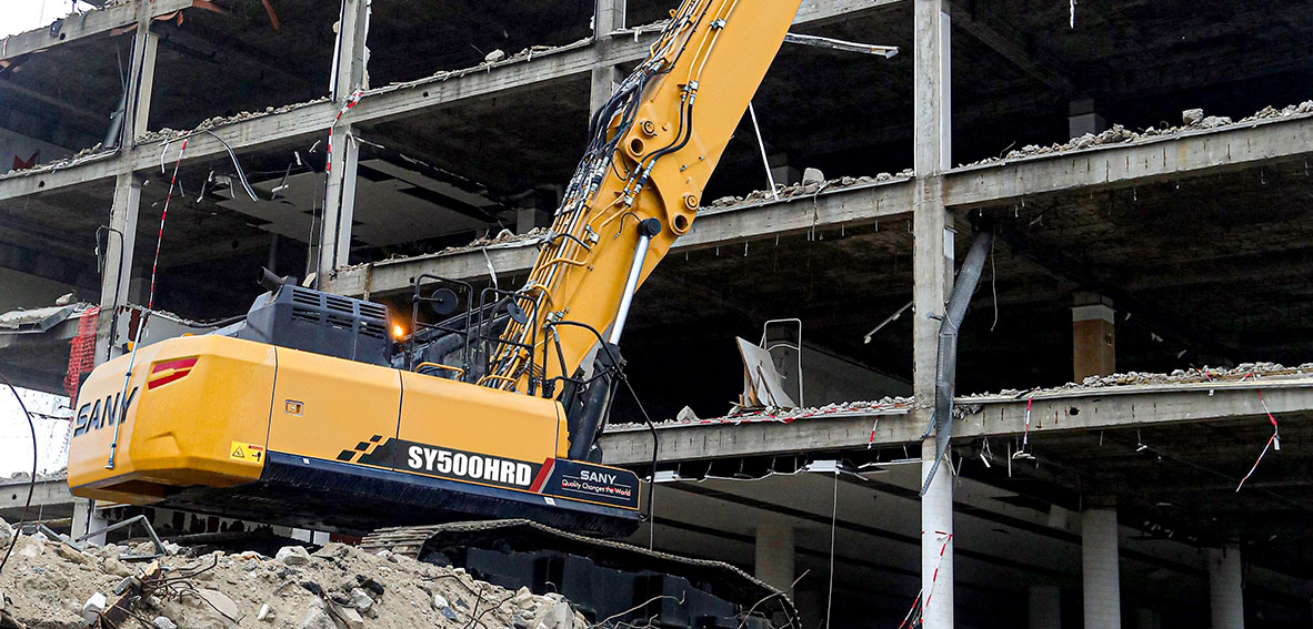 Excavator de înaltă performanță pregătit pentru provocări industriale. Dotat cu motor Cummins și braț extensibil, SY500HRD livrează rezultate impresionante în demolare și lucrări grele.